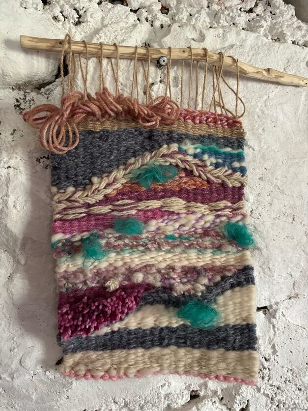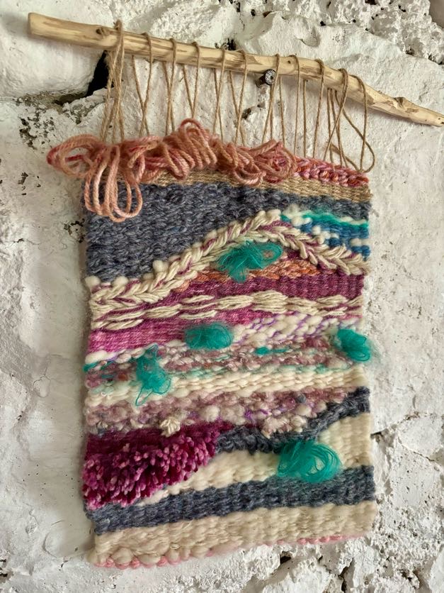 Tapiz rectangular realizado con  lanas de diversos colores teñidas  e  hiladas artesanalmente.
